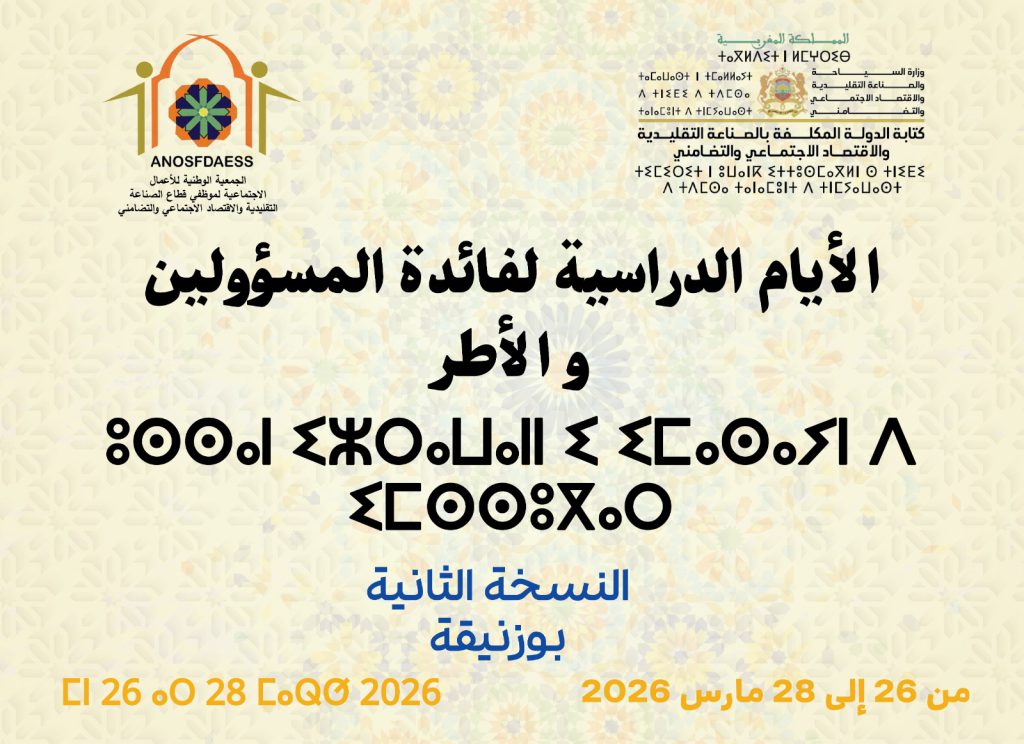 واستعرض كاتب الدولة خلال هذه الأيام الدراسية مجموعة من الأوراش الاستراتيجية ذات الأولوية، في مقدمتها استكمال هيكلة القطاع عبر إحداث الهيئات الحرفية، وتعميم وتفعيل البطاقة المهنية، وإرساء السجل الوطني للصناعة التقليدية، إلى جانب إصلاح منظومة التكوين المهني، مؤكداً في هذا السياق أهمية الاستعداد الجيد لتنظيم الأسبوع الوطني للاقتصاد الاجتماعي والتضامني.