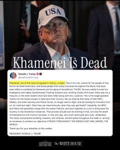 نشر الموقع الرسمي لـالبيت الأبيض صورة للرئيس الأمريكي دونالد ترامب مرفقة بتصريح منسوب إليه يعلن فيه وفاة المرشد الأعلى الإيراني علي خامنئي، ما أثار تفاعلاً واسعاً وجدلاً سياسياً وإعلامياً على المستوى الدولي.