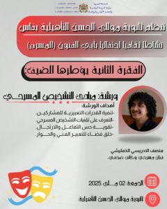 في إطار الاحتفاء باليوم الوطني للمسرح، واستحضارًا لقيمته كأحد أعمدة التثقيف الفني والتربية على القيم، تستعد الثانوية التأهيلية الأمير مولاي الحسن بمدينة فاس لتنظيم يوم ثقافي وتربوي متميز، يُترجم انفتاح المؤسسة على الدينامية الثقافية الوطنية وسعيها المتواصل لتنشيط الحياة المدرسية وربطها بمجالات الإبداع والمعرفة. ومن المرتقب أن يُنظم هذا الحدث يوم الجمعة 02 ماي 2025.