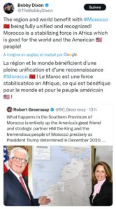 ففي تدوينة حديثة، اعتبر الخبير الأمريكي بوبي ديكسون (@TheBobbyDixon) أن “المنطقة والعالم يستفيدان من توحيد المغرب الكامل والاعتراف به”، مؤكداً أن المملكة تمثل “قوة مستقرة في إفريقيا، وهو أمر إيجابي للعالم وللشعب الأمريكي”.