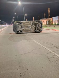 شهد شارع الحسن الثاني قرب شارع الصويرة، مساء السبت 22 مارس، انقلاب سيارة من نوع بيجو بالقرب من مقر مجلس مقاطعة المنارة في دوار لعسكر.