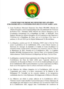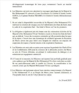 في إطار تعزيز العلاقات بين المملكة المغربية ودول الاتحاد، استقبل صاحب الجلالة الملك محمد السادس، نصره الله، ملك المغرب، يوم 28 أبريل 2025، وفداً رفيعاً من وزراء الشؤون الخارجية لدول الاتحاد، الذي يضم جمهورية مالي، جمهورية بوركينا فاسو وجمهورية النيجر.