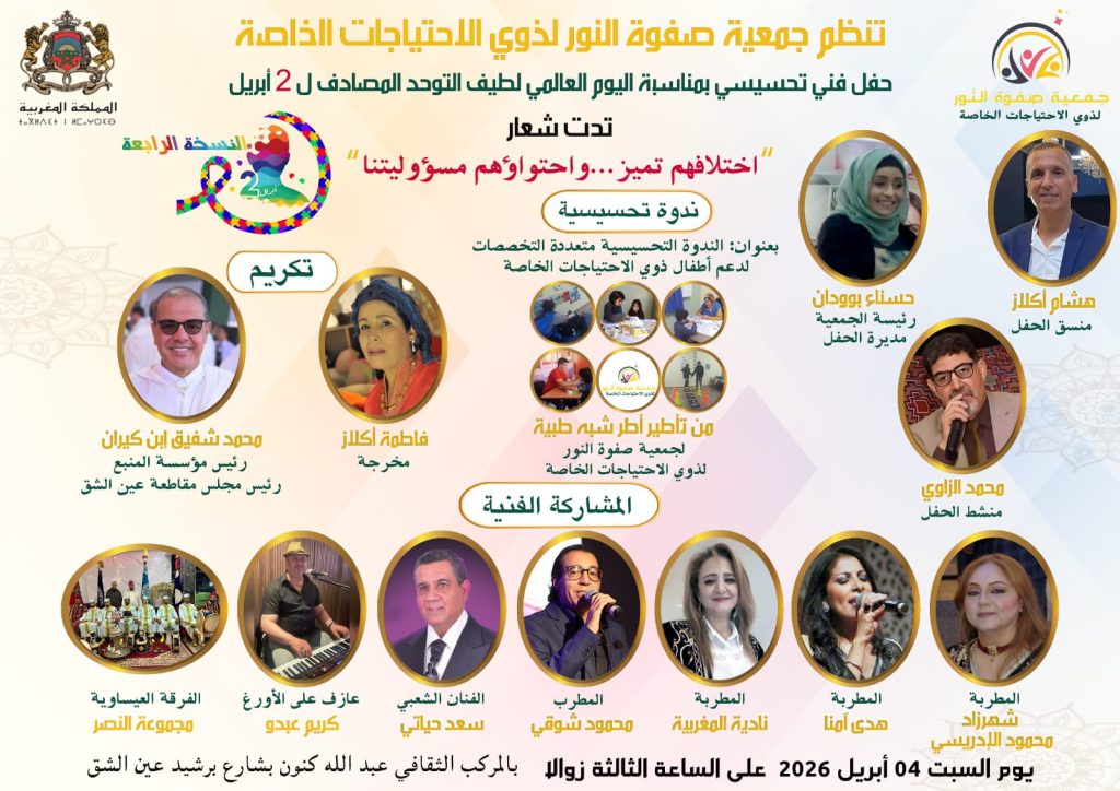 تنظم جمعية صفوة النور لذوي الاحتياجات الخاصة، يوم السبت 04 أبريل 2026، حفلاً تحسيسياً وفنياً بـ المركب الثقافي عبد الله كنون، وذلك بمناسبة اليوم العالمي للتوحد، في إطار جهودها الرامية إلى دعم أطفال طيف التوحد، وإبراز قدراتهم، والعمل على تعزيز إدماجهم داخل النسيج المجتمعي والتربوي.