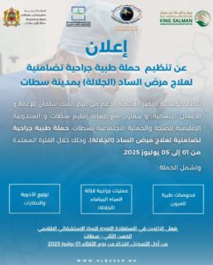 في بادرة إنسانية تنم عن عمق العلاقات الأخوية والتعاون المثمر بين المملكة المغربية والمملكة العربية السعودية، تشهد مدينة سطات خلال الفترة الممتدة من 01 إلى 05 يوليوز 2025 حملة طبية جراحية تضامنية لعلاج مرض الساد (الجلالة)، بتنظيم من مؤسسة البصر العالمية وبدعم كريم من مركز الملك سلمان للإغاثة والأعمال الإنسانية، وبتنسيق محكم مع عمالة إقليم سطات والمندوبية الإقليمية للصحة والحماية الاجتماعية.