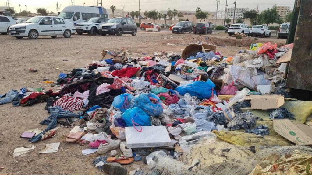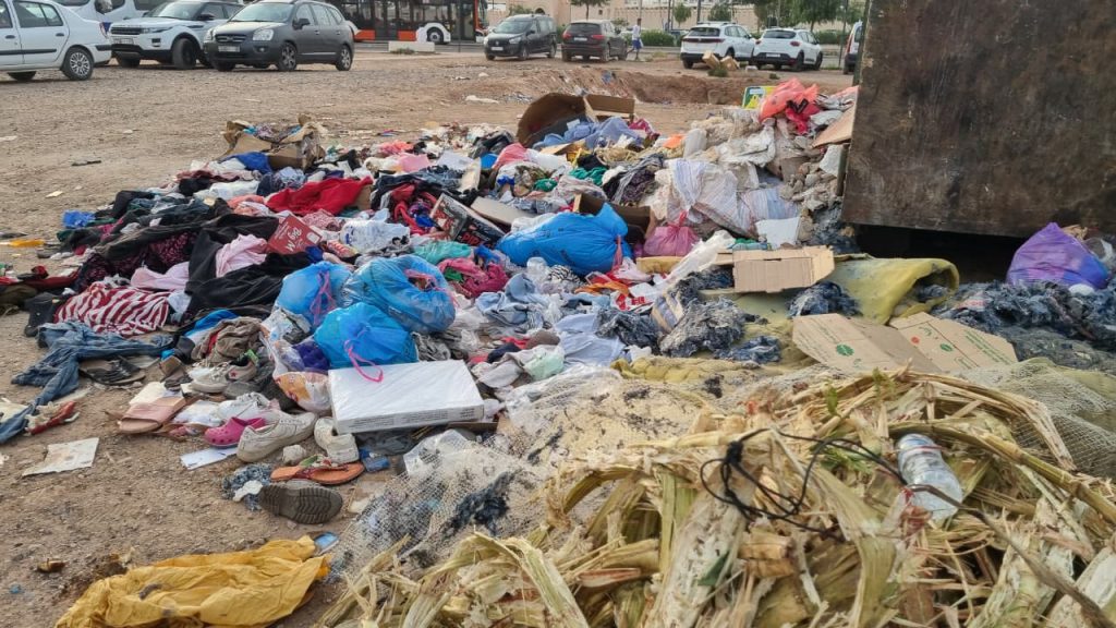 وكشفت المعاينات الميدانية، كما توثقها الصور، عن انتشار أكوام من الملابس المستعملة والأكياس البلاستيكية ومخلفات مختلفة تم التخلص منها بشكل عشوائي بالقرب من الفضاء التجاري وأمام سوق سيدي يوسف، في ظل غياب واضح لعمليات جمع منتظمة أو رقابة فعالة. ولا يؤثر هذا الوضع فقط على جمالية المكان، بل يشكل أيضًا تهديدًا بيئيًا وصحيًا، خاصة مع ارتفاع درجات الحرارة التي تسرّع من تحلل النفايات وتفاقم انتشار الحشرات.