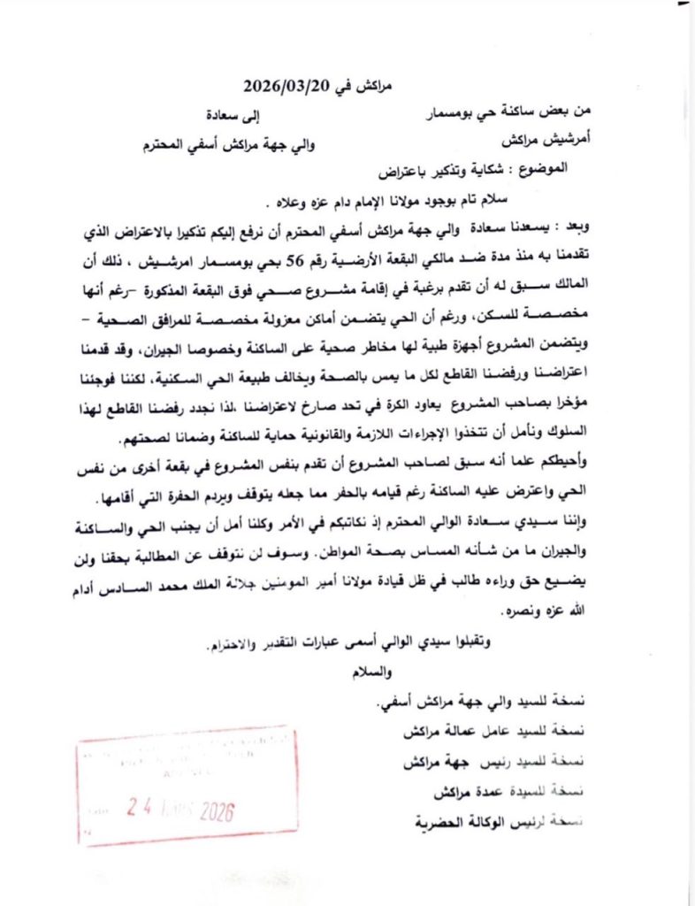 وجهت ساكنة حي بومسمار بمقاطعة جليز بمدينة مراكش شكاية جديدة، مرفقة بلائحة طويلة من توقيعات المتضررين، إلى والي جهة مراكش آسفي، تلتمس فيها وقف مشروع طبي عبارة عن مصحة للأشعة يجري الإعداد لإنجازه فوق بقعة مخصّصة للسكن، معتبرة أن المشروع “يهدد السلامة الصحية ويخالف قوانين التعمير”.