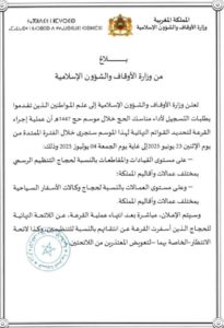 ويُعد موسم الحج محطة روحانية كبرى ينتظرها الآلاف من المواطنين سنويًا، إذ تسهر الوزارة على تنظيمه وفق شروط دقيقة ومعايير تضمن حسن التدبير واحترام الإجراءات التنظيمية والصحية المعمول بها.