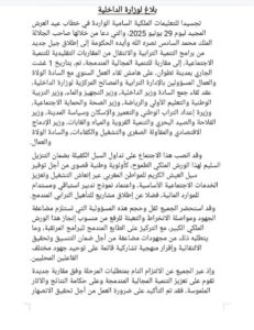 في سياق تخليد الذكرى الخامسة والعشرين لاعتلاء صاحب الجلالة الملك محمد السادس، نصره الله، عرش أسلافه المنعمين، ووفاء بالتوجيهات السامية الواردة في خطاب العرش ليوم 29 يوليوز 2025، عقدت وزارة الداخلية اجتماعين هامين يرومان تسريع وتيرة التنزيل الفعلي لمضامين النموذج التنموي الجديد، والارتقاء بجودة السياسات العمومية بما يستجيب لانتظارات المواطنات والمواطنين.