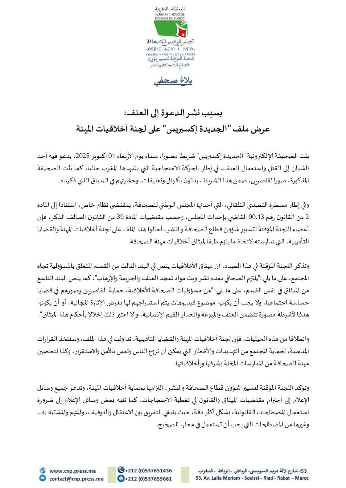 المجلس الوطني للصحافة يحيل صحيفة إلكترونية على لجنة أخلاقيات المهنة بسبب نشر دعوة إلى العنف