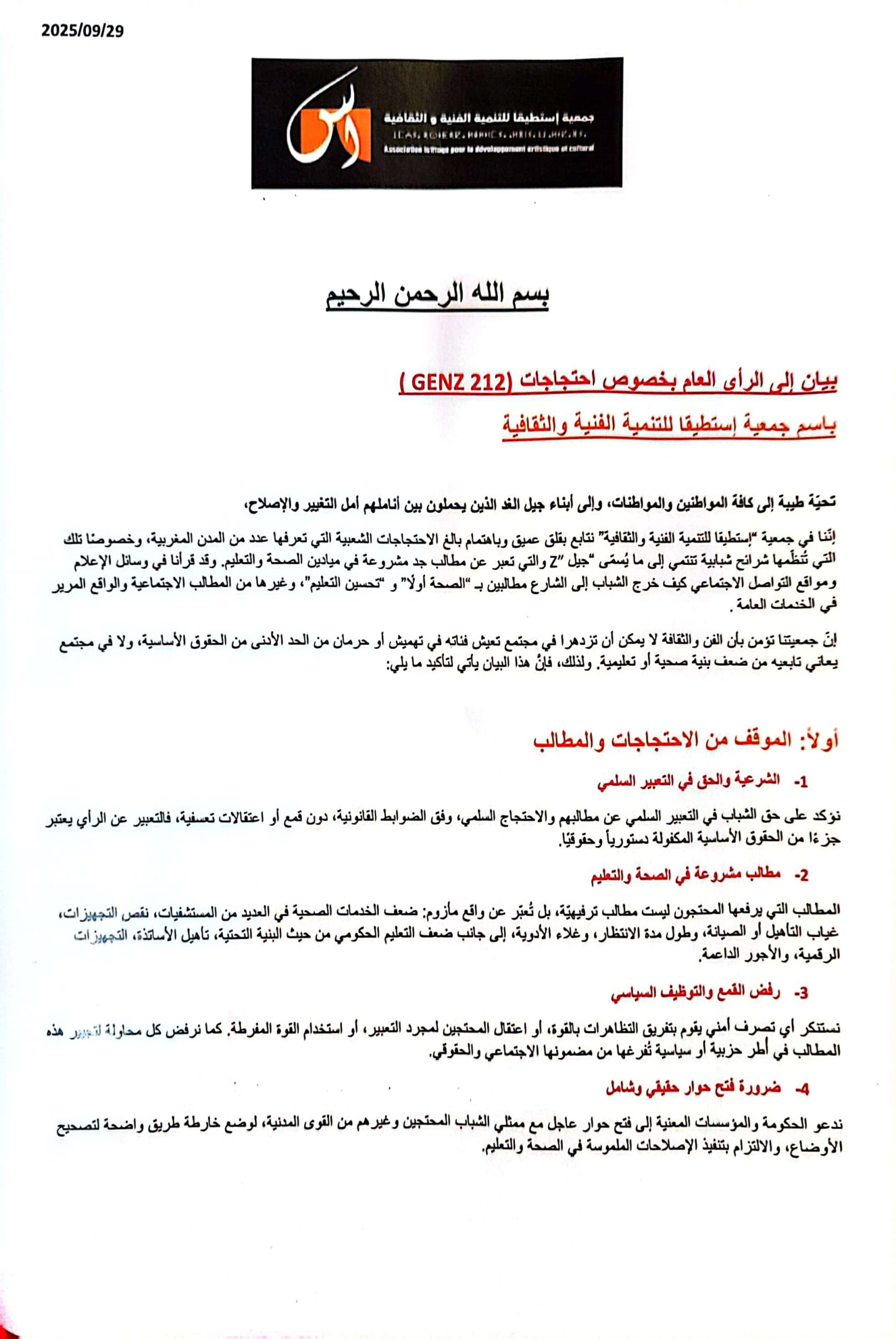 بيان إلى الرأي العام بخصوص احتجاجات ( GENZ 212) باسم جمعية إستطيقا للتنمية الفنية والثقافية