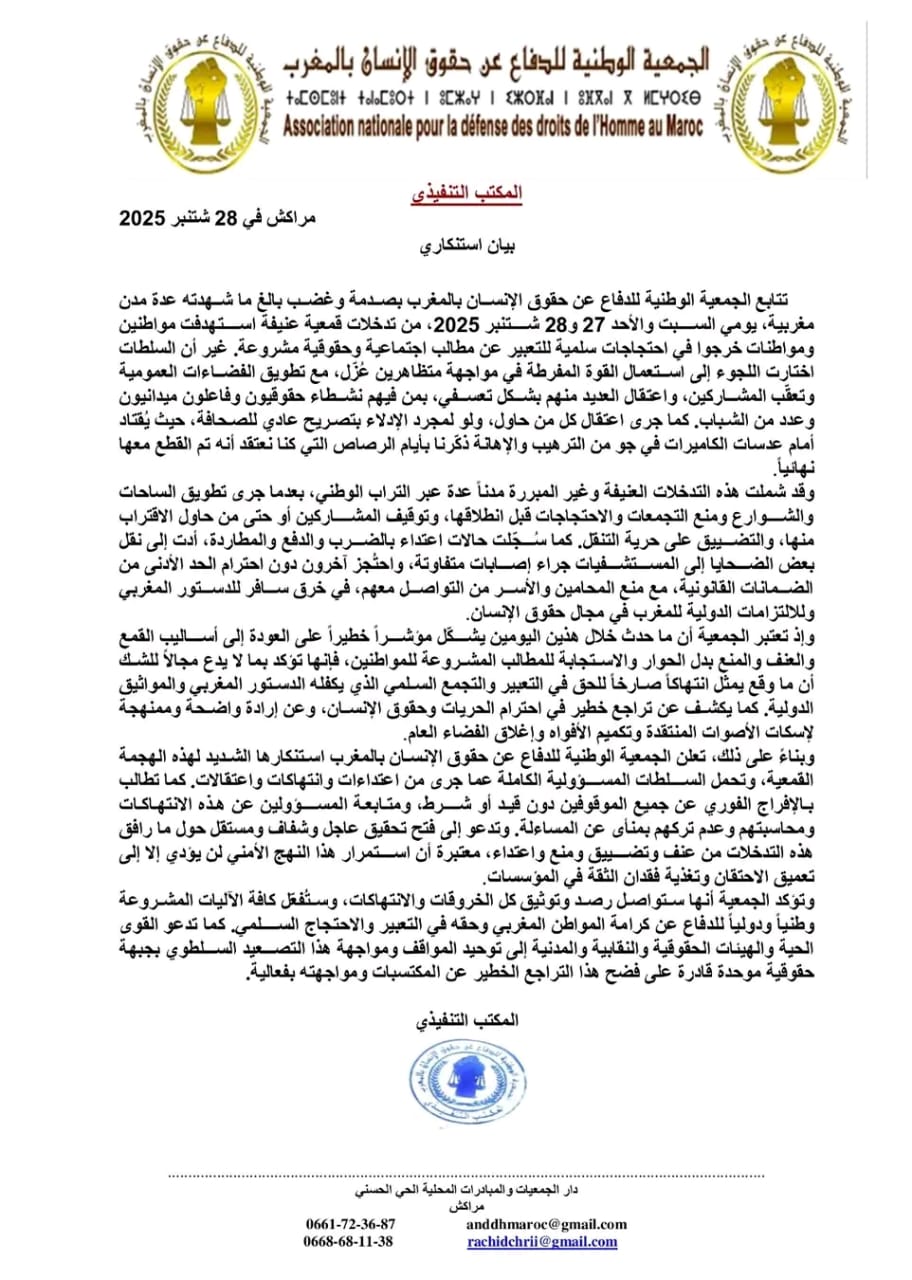 الجمعية الوطنية للدفاع عن حقوق الانسان تستنكر التدخلات الأمنية ضد احتجاجات سلمية وتدعو الى المساءلة