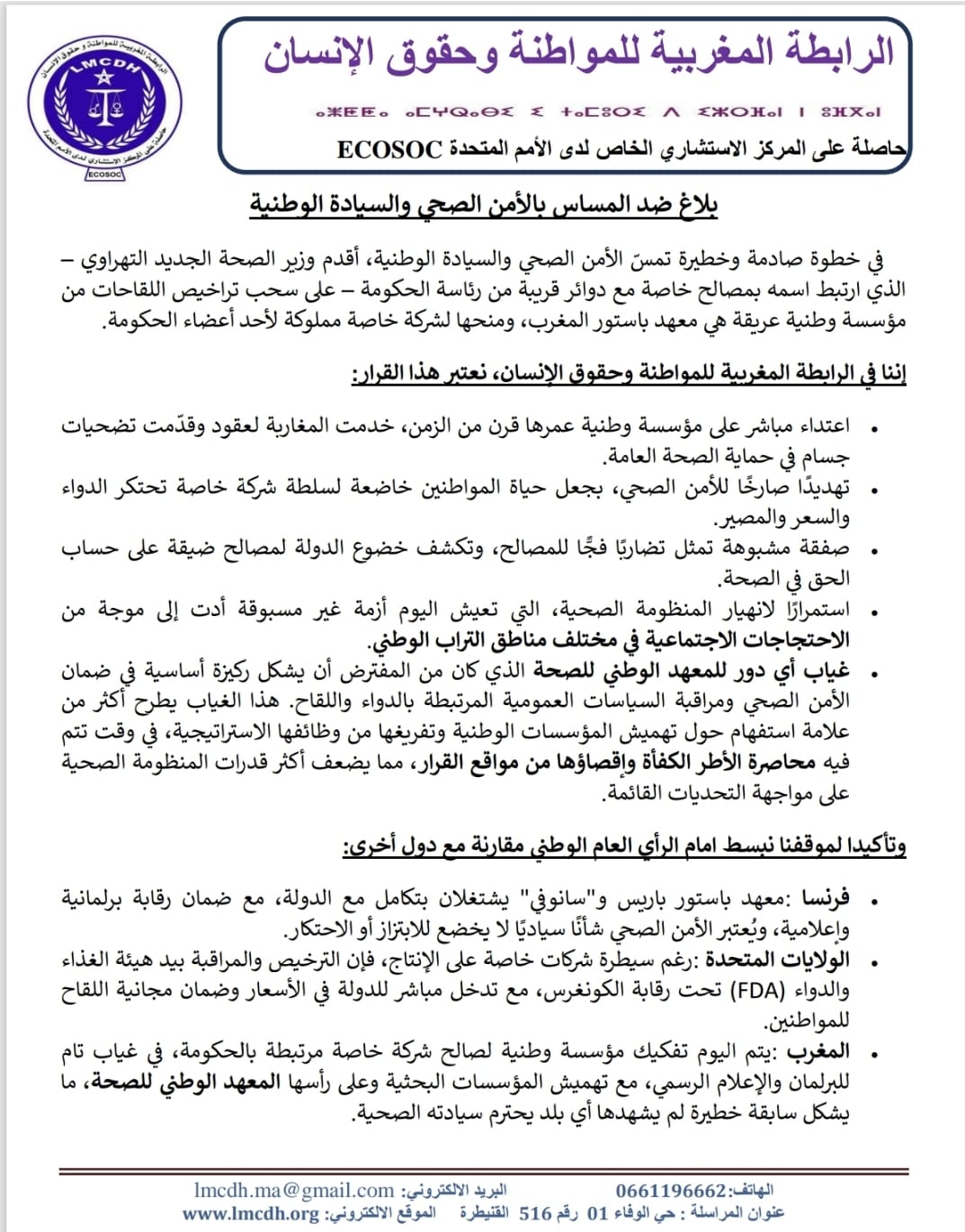 بلاغ ضد المساس بالأمن الصحي والسيادة الوطنية