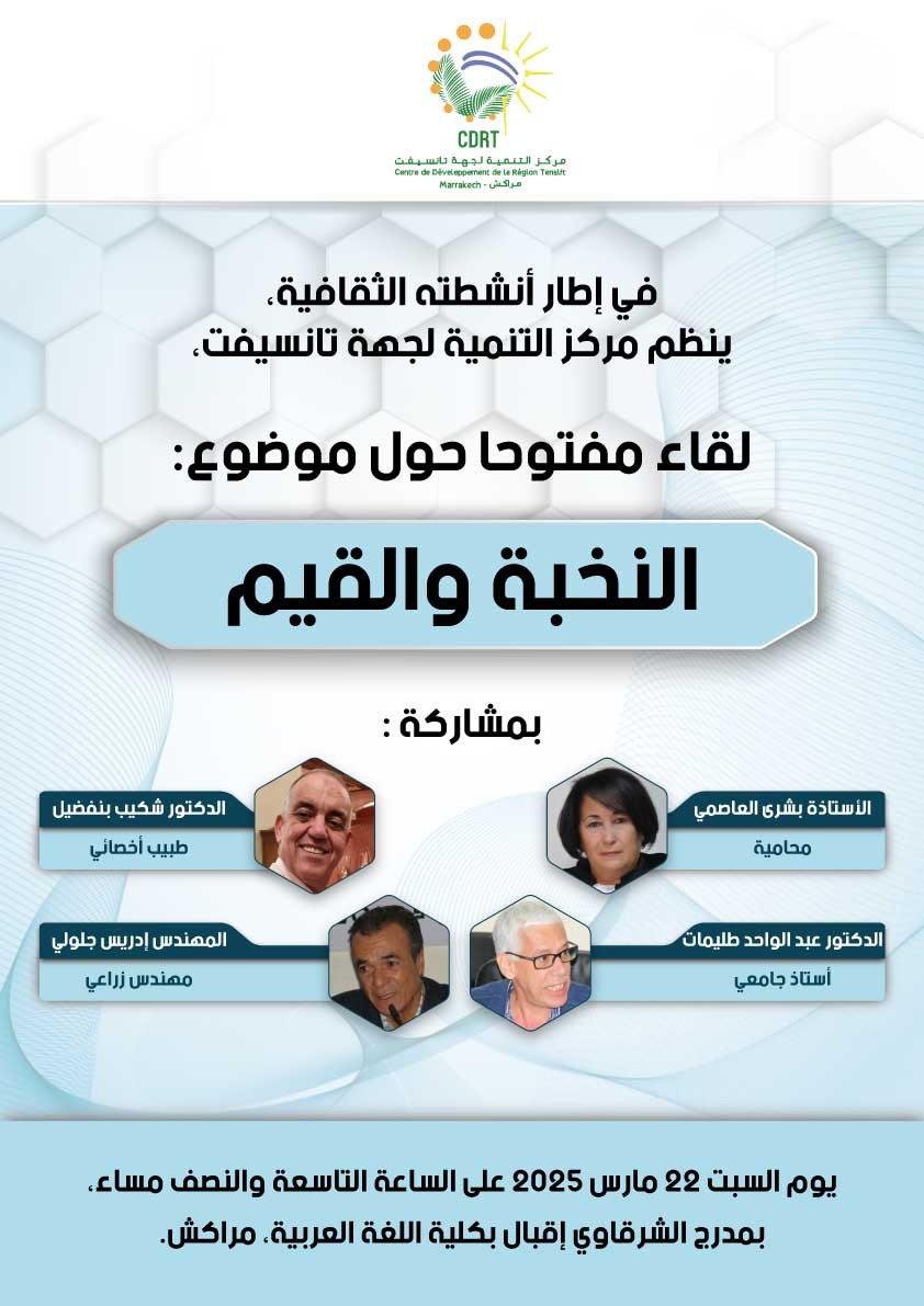 “النخبة و القيم “موضوع لقاء مفتوح ينظمه مركز التنمية لجهة تانسيفت.