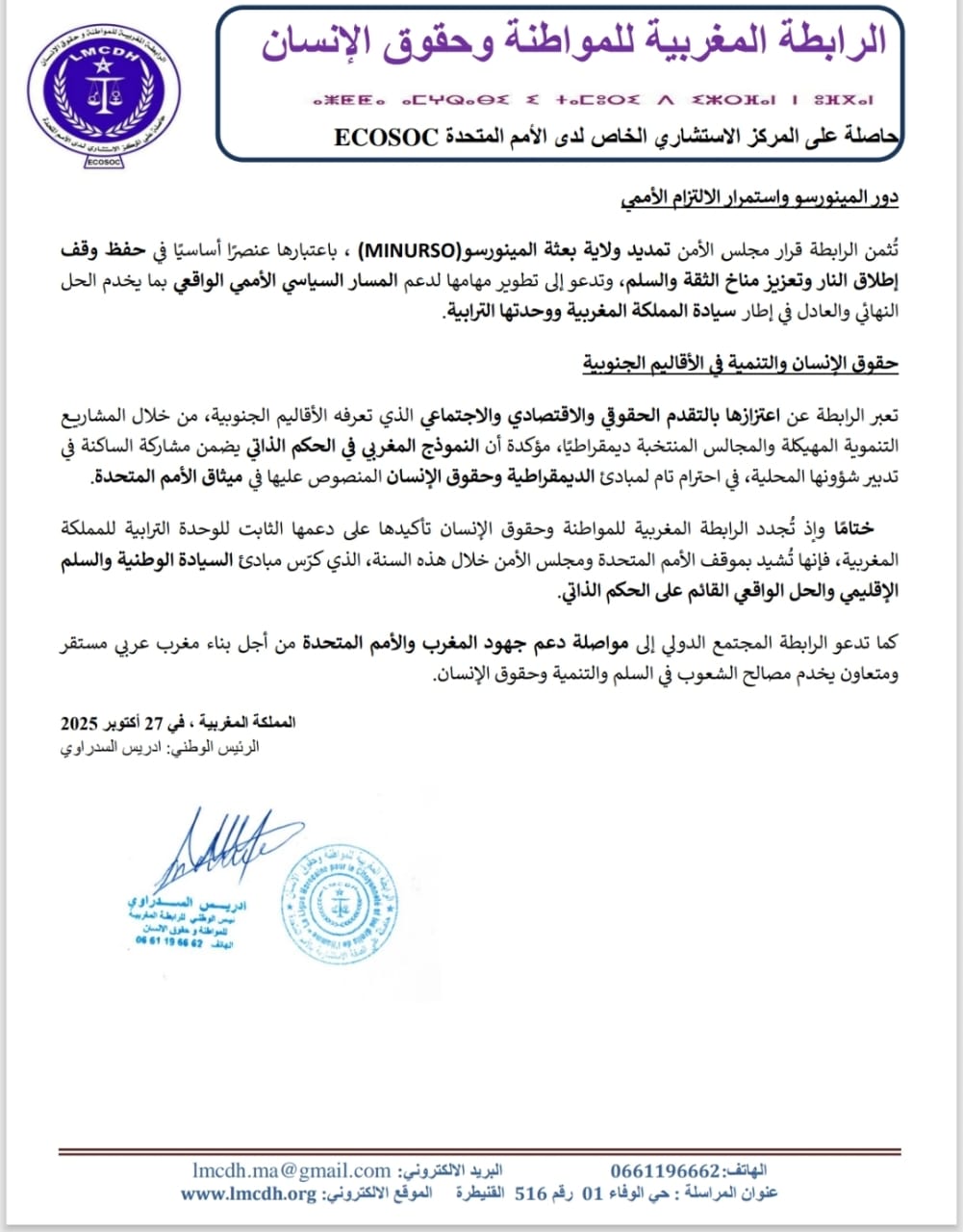 بلاغ بمناسبة اليوم العالمي للأمم المتحدة حول مستجدات قضية الصحراء المغربية