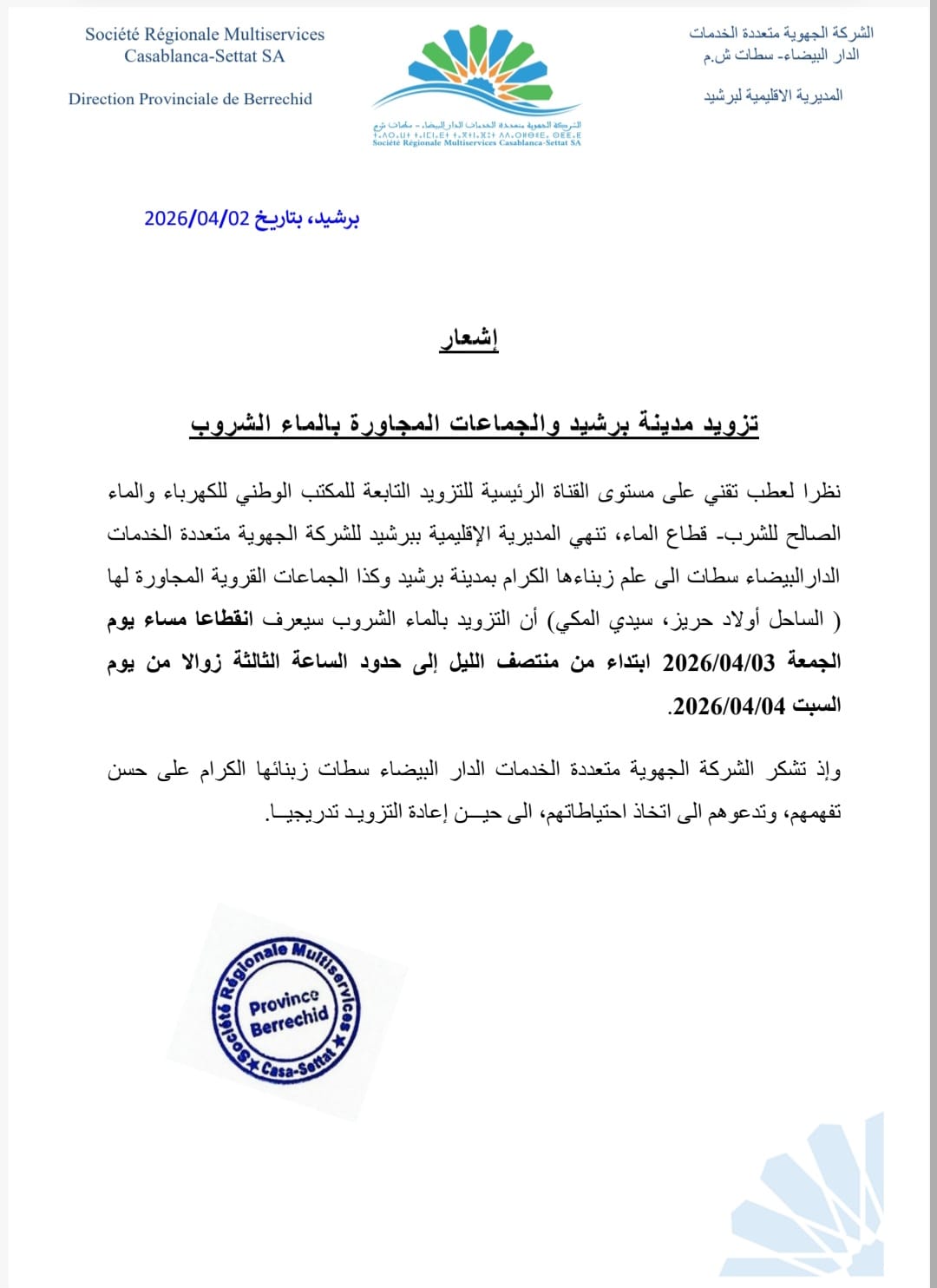 انقطاع مؤقت للماء الشروب ببرشيد ونواحيها بسبب عطب في القناة الرئيسية