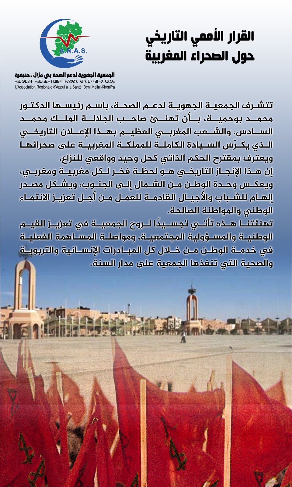 الجمعية الجهوية لدعم الصحة تهنئ المغاربة باسم رئيسها الدكتور محمد بوحمية بمناسبة القرار الأممي التاريخي