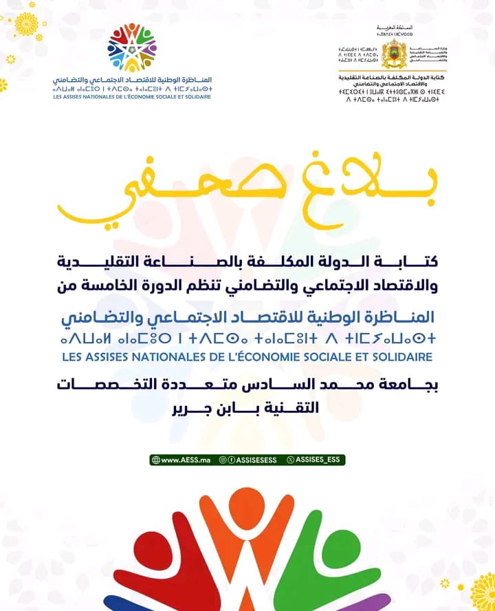 الأحد 08 يونيو 2025 - 10:10 بلاغ صحفي حول الدورة الخامسة من المناظرة الوطنية للاقتصاد الاجتماعي والتضامني بجامعة محمد السادس متعددة التخصصات التقنية بابن جرير